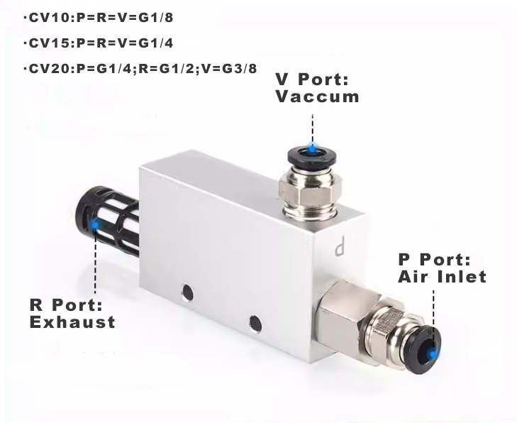 ຜູ້ຜະລິດສູນຍາກາດ CV ແມ່ນໃຊ້ເພື່ອສະພາບສະພາບແວດລ້ອມທີ່ຈໍາເປັນສໍາລັບການດູດຊືມຫລືເຄື່ອງປະດັບ. ທ່າເຮືອ Intake ຄວນຈະຖືກເຊື່ອມຕໍ່ກັບອາກາດທີ່ບີບອັດ, ໃນຂະນະທີ່ຈອກດູດແມ່ນເຊື່ອມຕໍ່ກັບພອດສູນຍາກາດ. ໃນເວລາທີ່ອັດແຫນ້ນກະແສໄຟຟ້າຈາກພອດ intake ກັບທ່າເຮືອທີ່ສະຫາຍ, ສູນຍາກາດແມ່ນຜະລິດຢູ່ທ່າເຮືອສູນຍາກາດ. ແຮງສູນຍາກາດນີ້ສາມາດໃຊ້ໃນການຍຶດຫມັ້ນວັດຖຸ, ບັນລຸວຽກງານເຊັ່ນ: ການແກ້ໄຂຫຼືການສະຫນັບສະຫນູນ, ປັບປຸງປະສິດທິພາບໃນການຜະລິດອຸດສາຫະກໍາ.