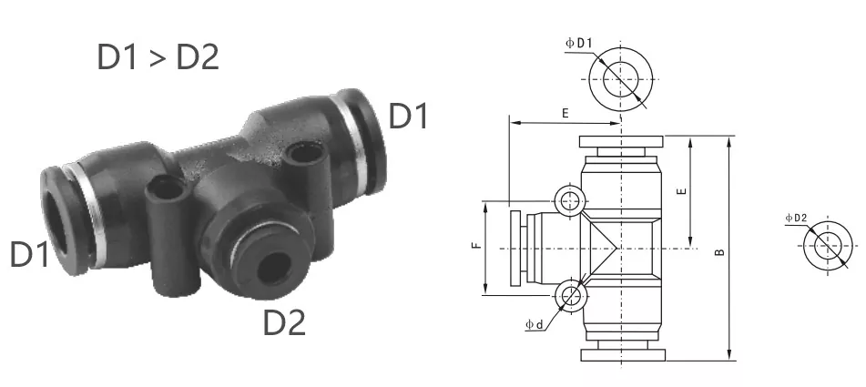 PE ທີ່ເຫມາະສົມ (ສະຫະພັນ tee ເທົ່າກັນ): ທັງຫມົດ 3 ທໍ່ມີເສັ້ນຜ່າສູນກາງນອກດຽວກັນ, ເຫມາະສົມກັບການເຊື່ອມຕໍ່ສາມທໍ່ pneumatic ຂອງຂະຫນາດດຽວກັນ.