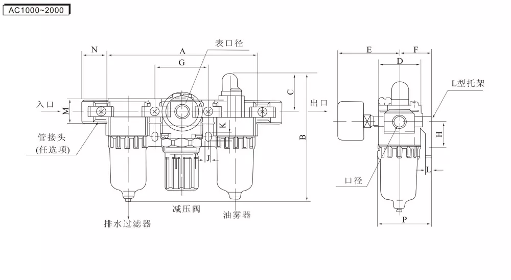AF (Air Filter) + AR (ວາວຄວບຄຸມຄວາມກົດດັນ) + AL (Oil Mist Lubricator) = AC Triple Unit